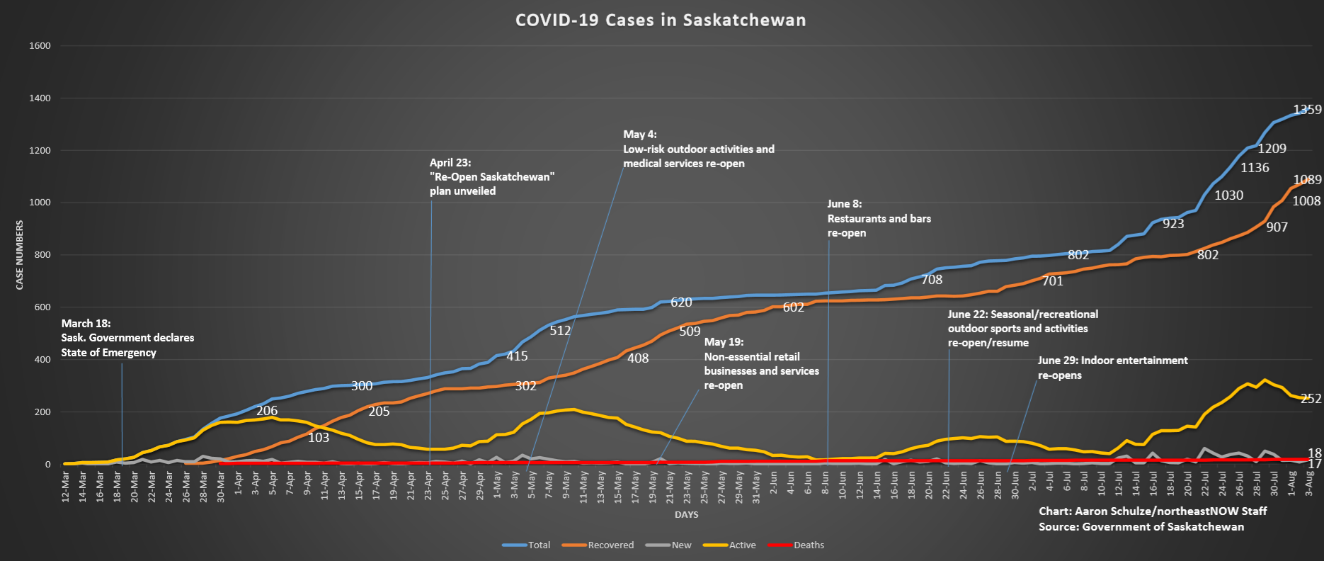 Of the 1,359 reported cases, 252 are considered active. A total of 1,089 people have recovered.