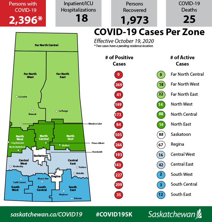 A total of 27 of the new cases are across the north: Far North West (three), Far North East (three), North West (four), North Central (17), North East (one). The rest of the new cases are across a number of other zones: Saskatoon (25), Central West (two), Central East (two), Regina (eight) and South West (one) zones.