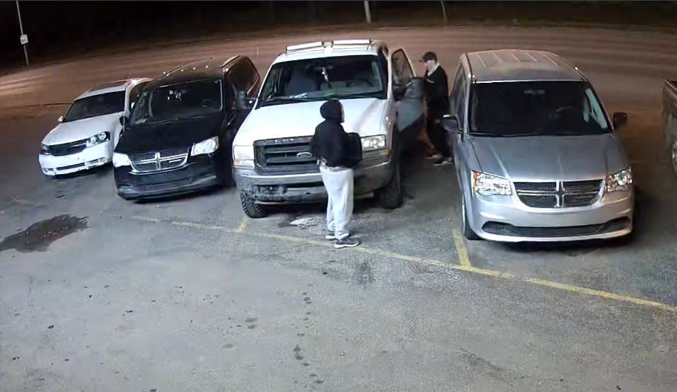 While reviewing CCTV, police observed two suspects breaking into a white Ford F250 with Saskatchewan license plate 794 MCJ.