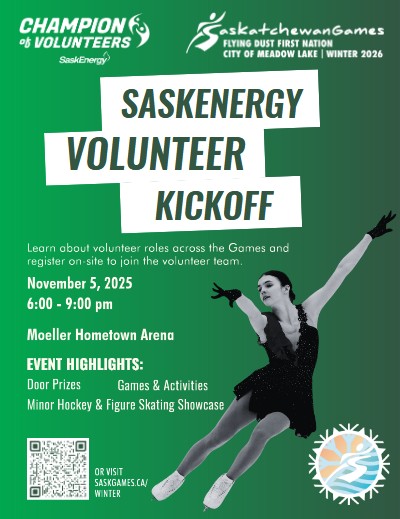 By Saskatchewan Games SaskEnergy Volunteer Kickoff Oct 24, 2025 | 8:52 AM Share on Facebook Share on Bluesky Share on X Copy Link Volunteers are needed for the Saskatchewan Games. See the attached posters.