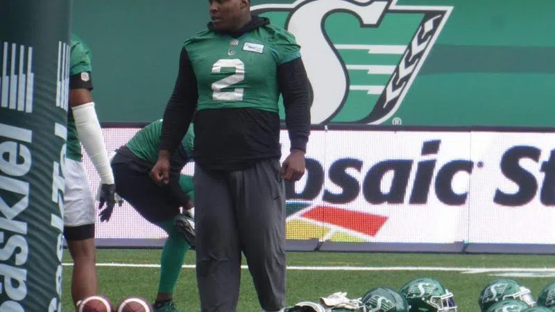 Aug 31, 2019 Saskatchewan Roughriders defensive lineman Micah Johnson during practice on Aug. 30, 2019. (Britton Gray/980 CJME)